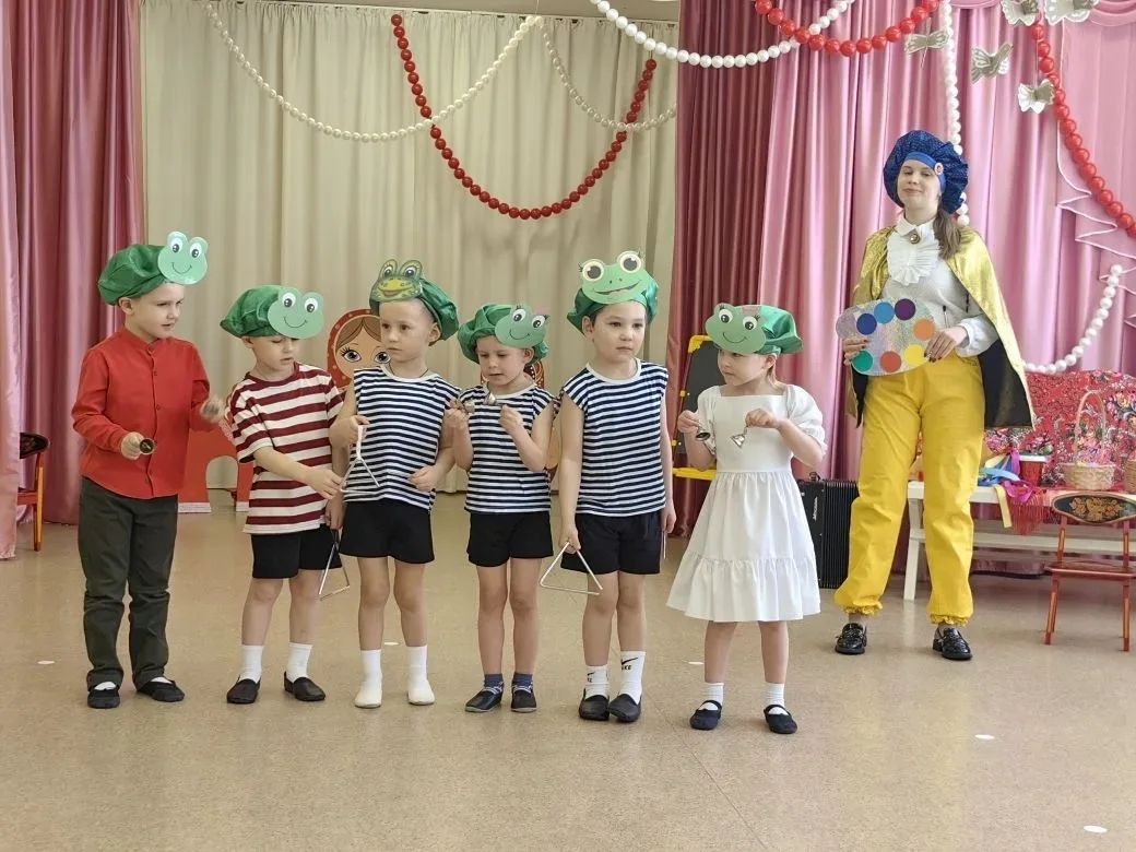 Самым неожиданным сюрпризом для родителей стало выступление «лягушачьего оркестра». Маленькие музыканты в забавных костюмах лягушат виртуозно исполнили ласковую мелодию на треугольниках и колокольчиках.